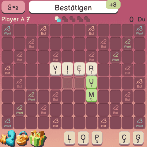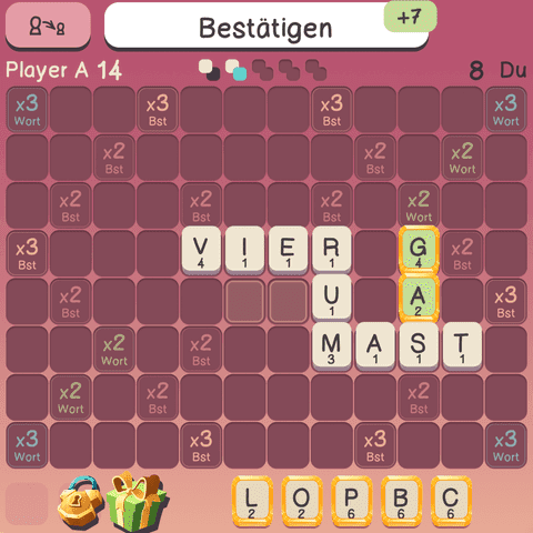 Finde in diesem Spiel für zwei Personen die längeren Wörter. Nutze dafür die Buchstaben deines Gegenübers geschickt aus und um richtig zu punkten, bring deine mächtigen Booster zum Einsatz!